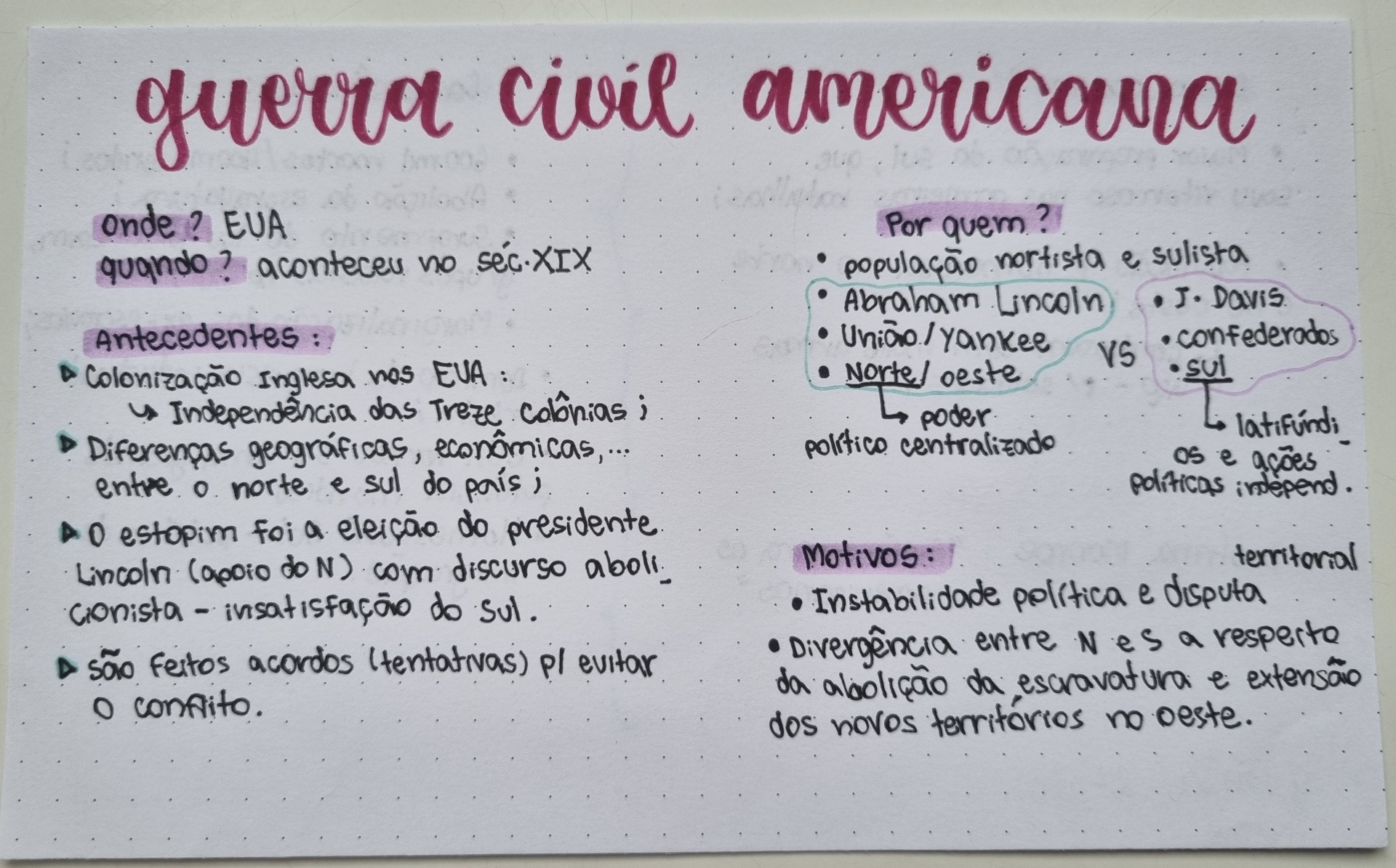 A Guerra Civil Americana (1861-1865) foi uma guerra entre o Norte (União) e o Sul (Confederação) dos EUA, principalmente por causa da escravidão. O Norte, liderado por Abraham Lincoln, queria acabar com a escravidão, enquanto o Sul queria mantê-la. A guerra começou quando estados sulistas se separaram e atacaram Fort Sumter. A União venceu, aboliu a escravidão (13ª Emenda) e reunificou o país, mas deixou o Sul destruído e a nação dividida. A reconstrução pós-guerra tentou reintegrar o Sul e garantir direitos aos ex-escravos, enfrentando muita resistência.